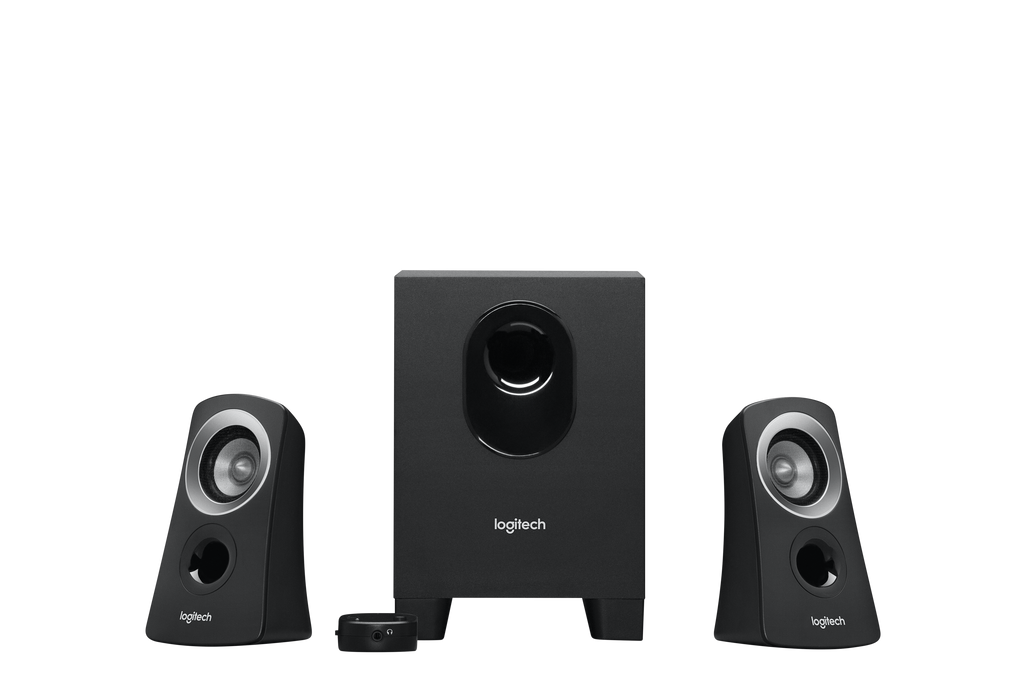 Logitech 2.1 system with 25W RMS power and compact down-firing subwoofer. Wired control pod for easy access to power and volume.